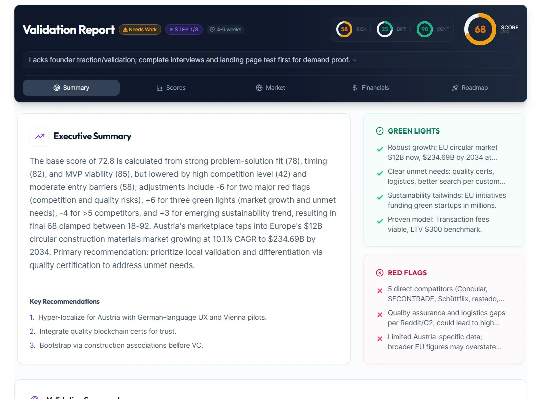 Reports include viability score (0-100), market size analysis (TAM/SAM/SOM), competitor mapping, target audience profiles, SWOT analysis, risk assessment, and actionable recommendations.